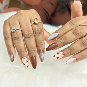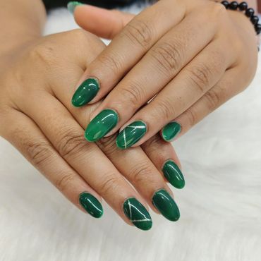 Cat eye nails are one of the most popular nail trends right now, known for their shimmery, reflective finish that mimics the glowing streak of a cat’s eye. The look is created using magnetic nail polish and a special magnet that pulls metallic particles into a line or pattern, giving the nails a velvet-like depth and gemstone glow. They shift beautifully under different lighting, making them eye-catching without needing complex nail art.